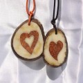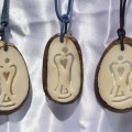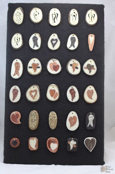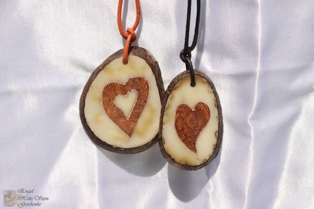 Die hier gesehenen Anhänger fertige ich aus einer Taguanuss (pflanzliches Elfenbein), in dem ich sie mit Edelholzintarsien bearbeite bzw. Ausschnitte mit Engelssymbolen oder Ähnlichem anfertige. Ein tolles und beliebtes Geschenk auf jeder Messe!