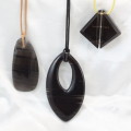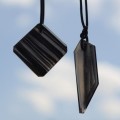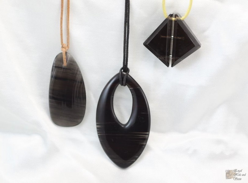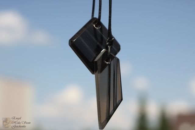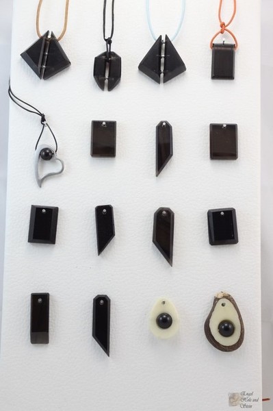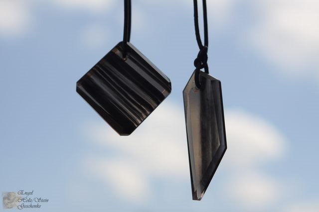 Ebenfalls fertige ich Lamellenobsidian Anhänger in verschiedenen Formen an, welche ich selbst zuschneide, schleife und poliere. Auch führe ich industriell gefertigte Anhänger wie Engel, Donuts oder Tropfen.