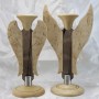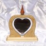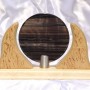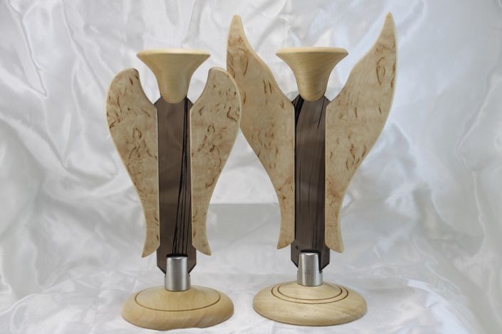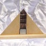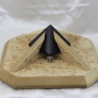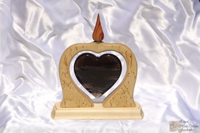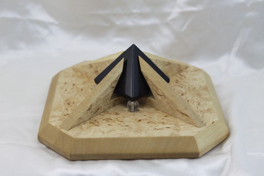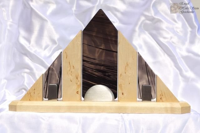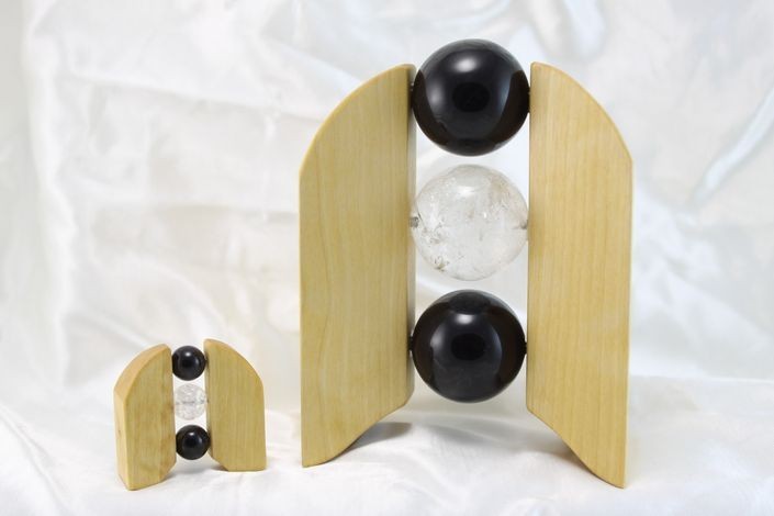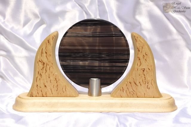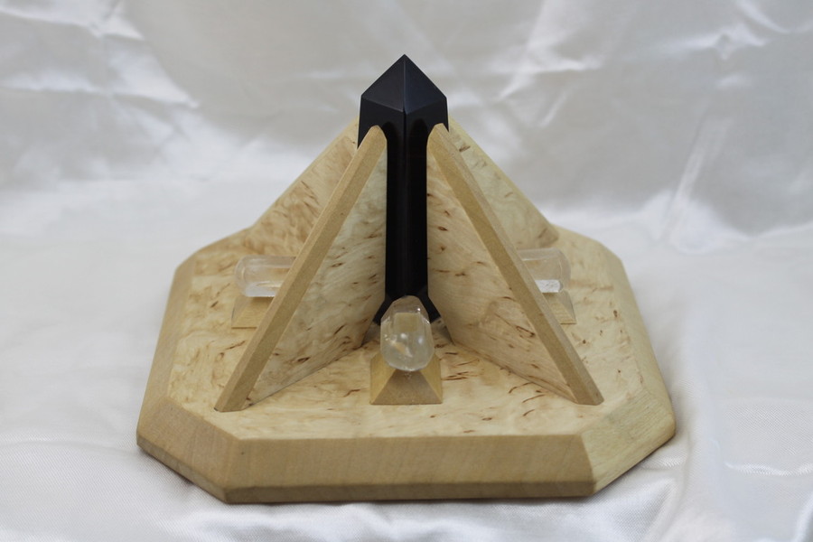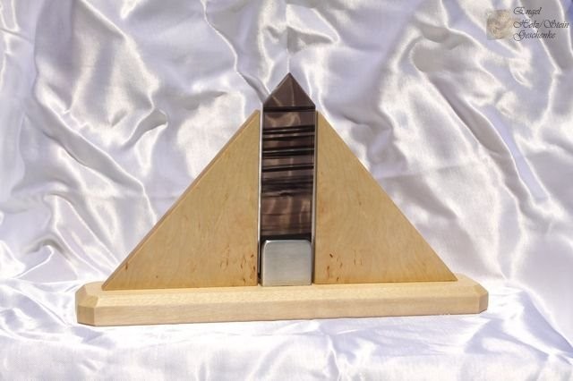 Ein Hingucker auf jeder Messe sind die Lamellenobsidianformen mit Holz. Die Scheiben-, Pyramiden- bzw. Herzformen haben eine besondere Bedeutung. Die Skulpturen sind immer so aufgebaut, dass die Energien durch das Holz zugeführt und durch den Lamellenobsidian verarbeitet werden.